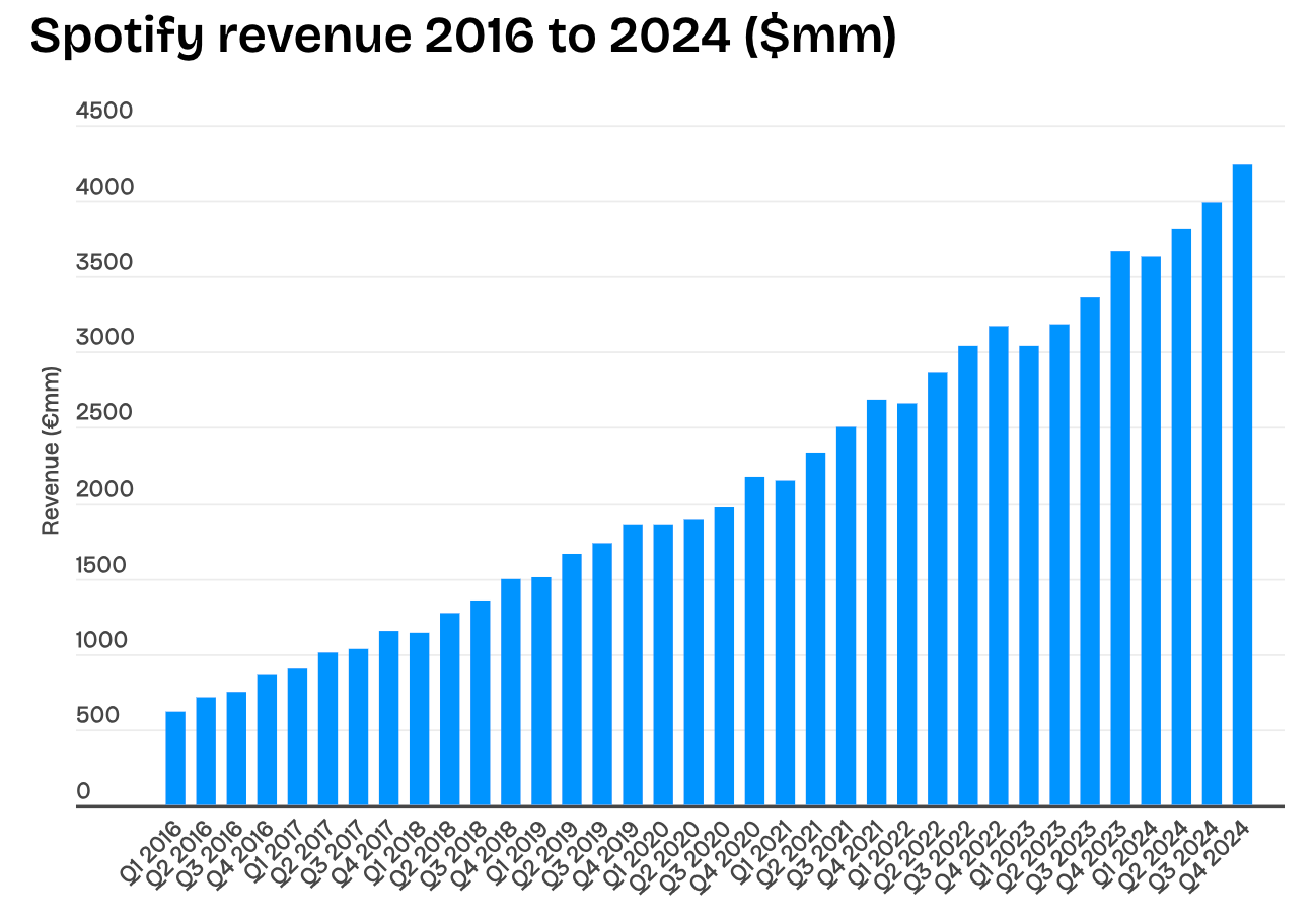 Subscriber Growth: Spotify had 675 million active users globally and 263 million premium subscribers as of January 2025.