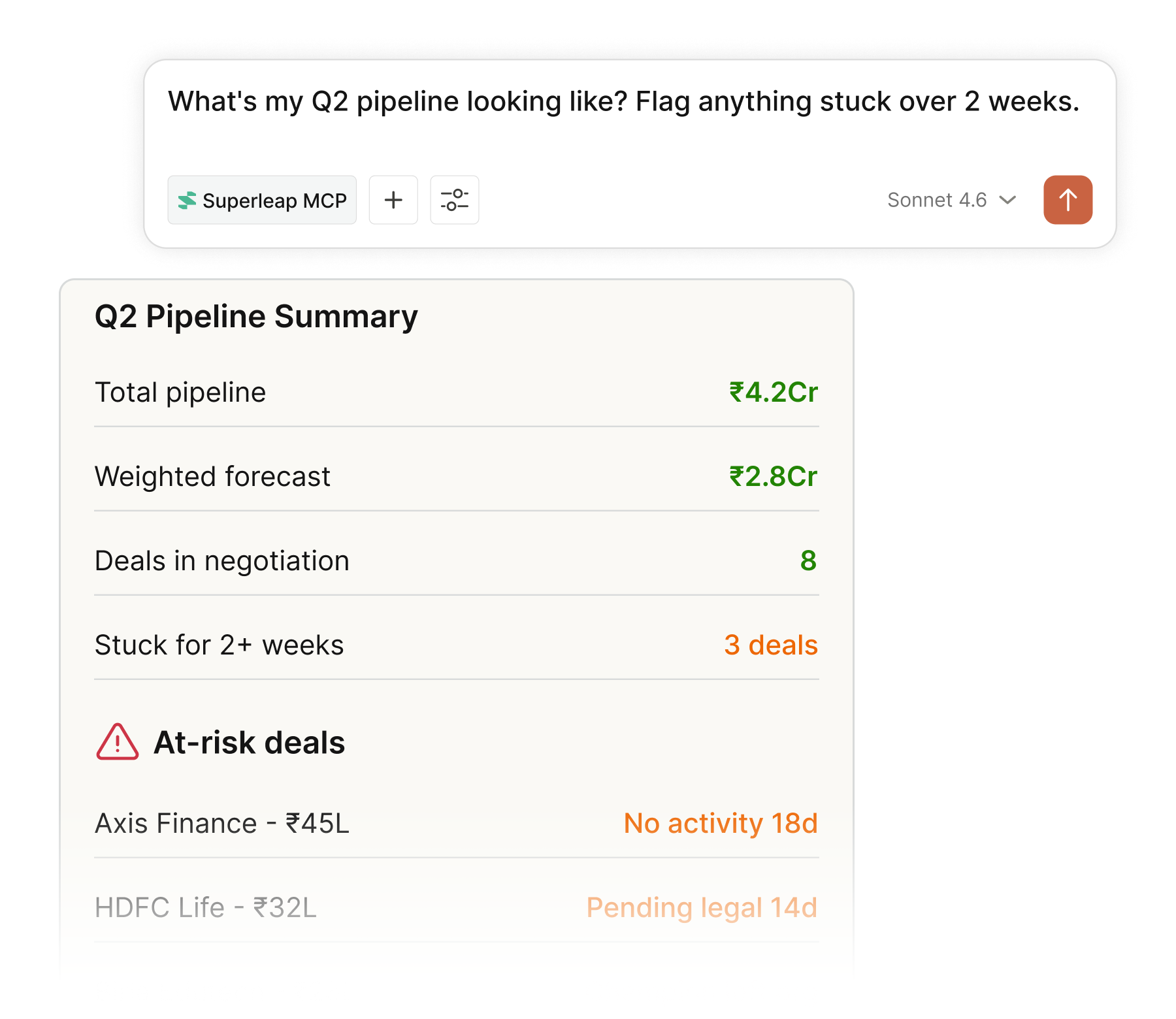 Open a conversation in your chosen AI tool. Ask anything about your pipeline in plain language. The AI pulls live data from Superleap