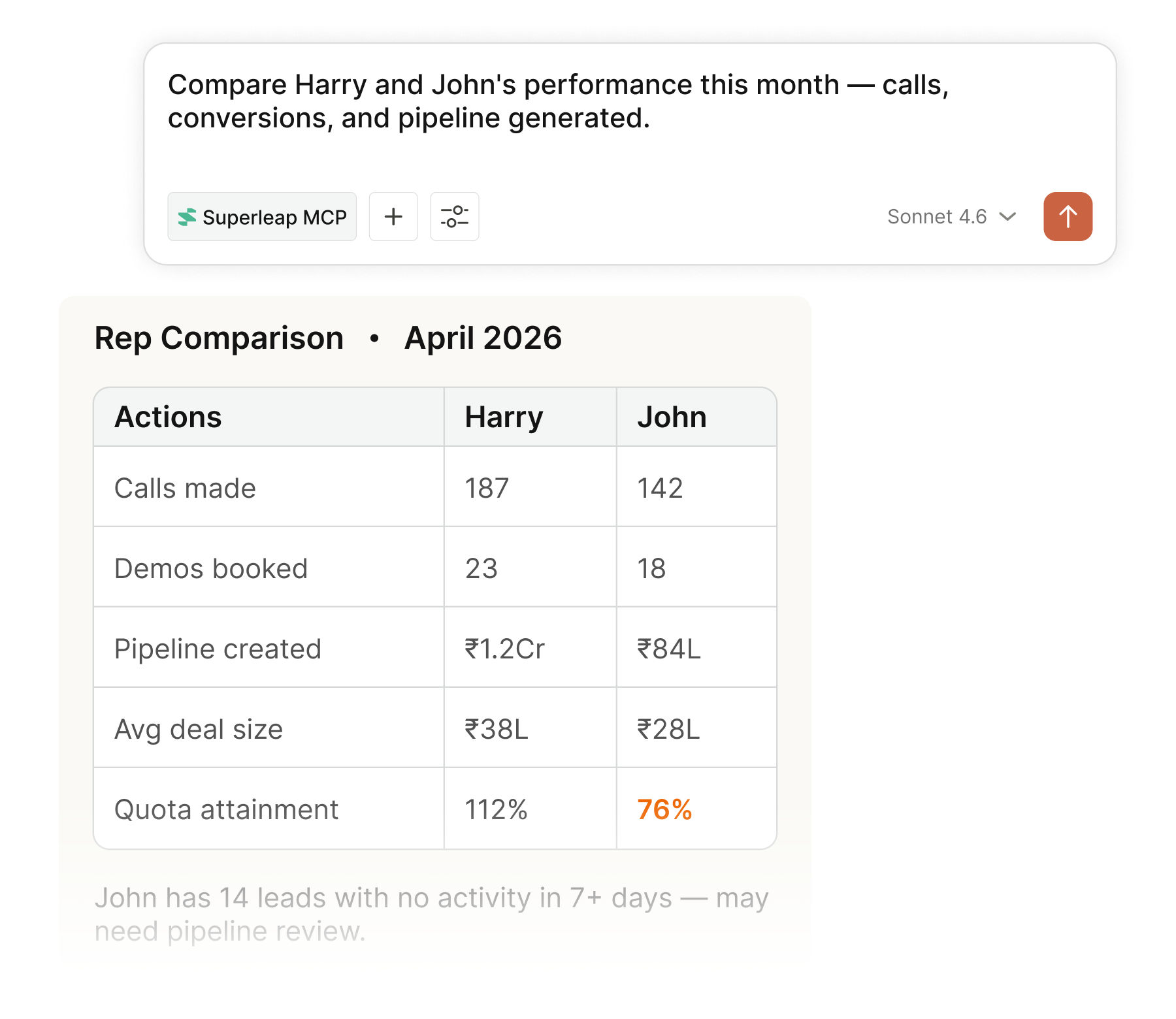 Superleap MCP connects your full CRM data layer like leads, deals, accounts, activities, calls, and custom objects — to the AI tools your team already uses.